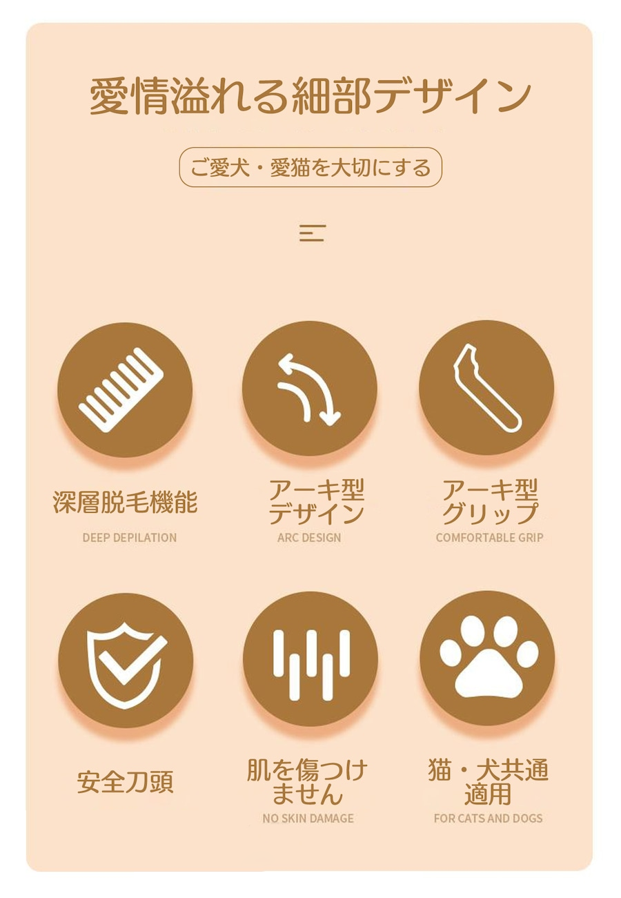 弧形刃デザインは、ペットの体にフィットし、毛を傷めることなく快適にカットします。ペット用薄毛用コームとしても機能し、優しく毛をとかしながら仕上げることができます。これで面倒な毛のお手入れが、もっと楽しくなります!
