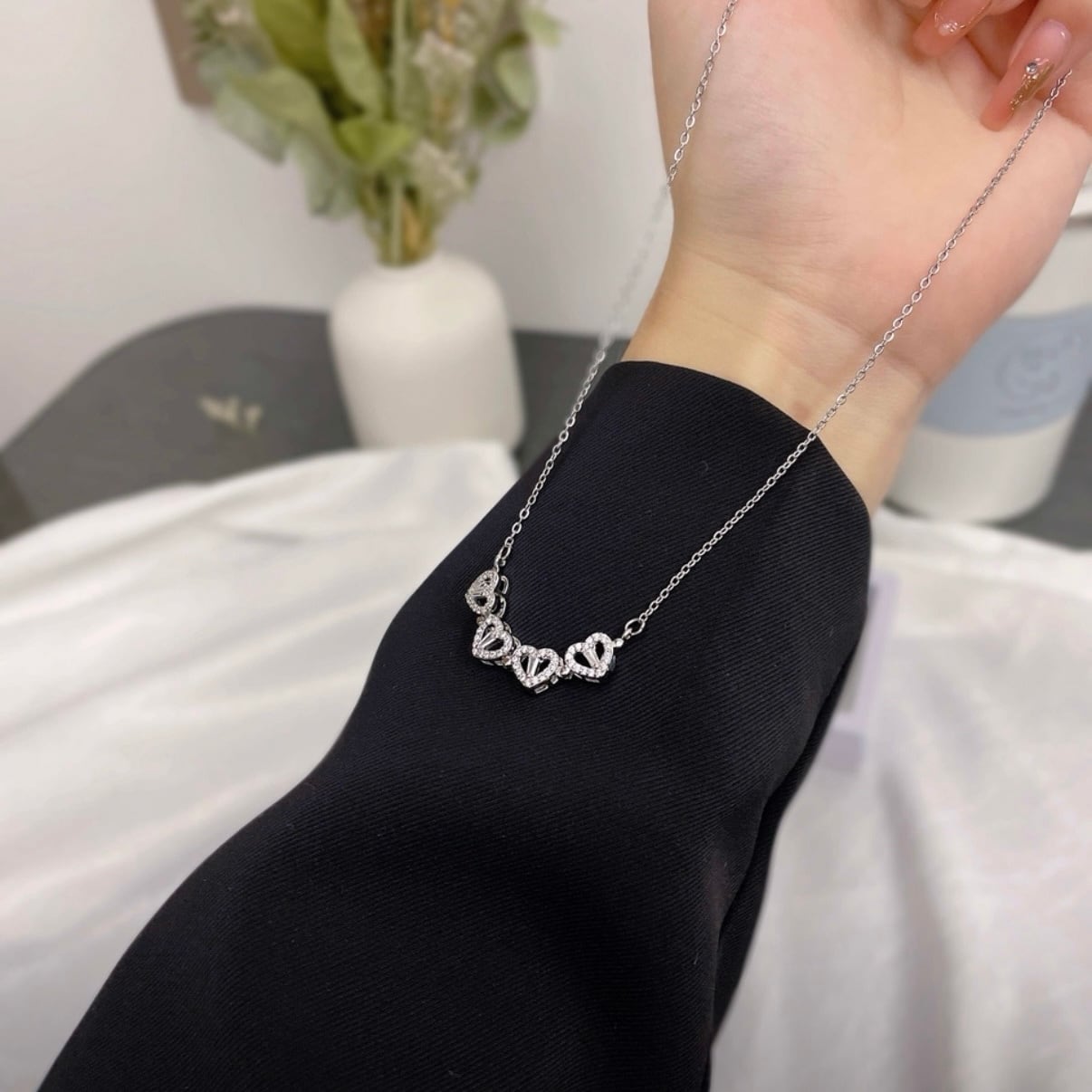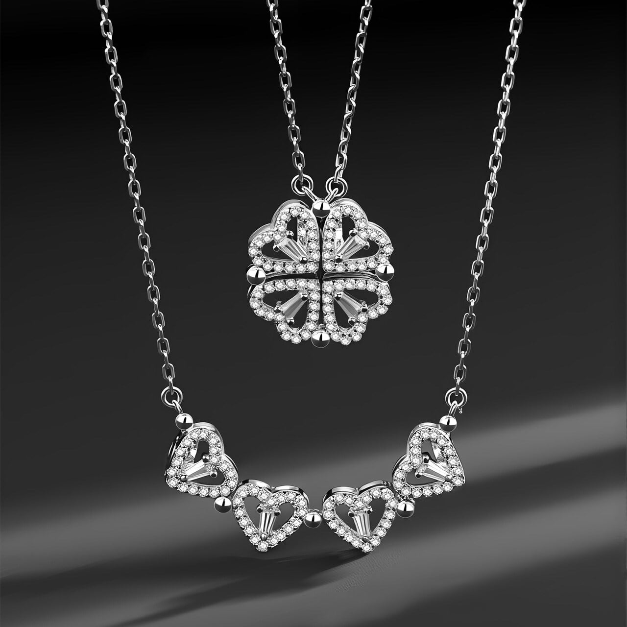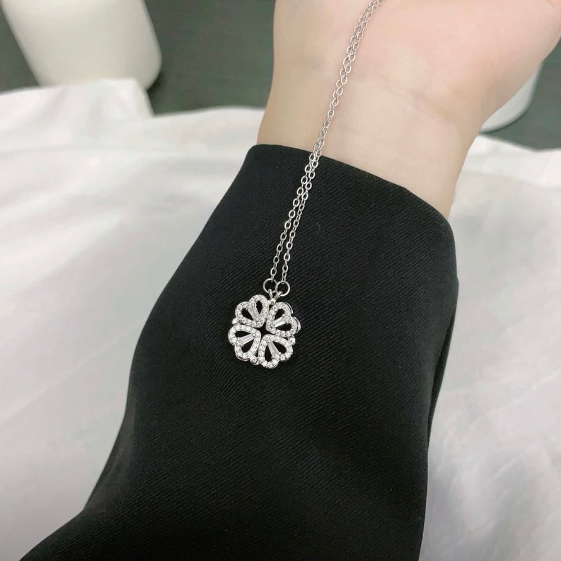 88. 四つ葉クローバーネックレス ▼ SV925銀製 人工ジルコニウム装飾 マグネット式2WAY着用 ハート型