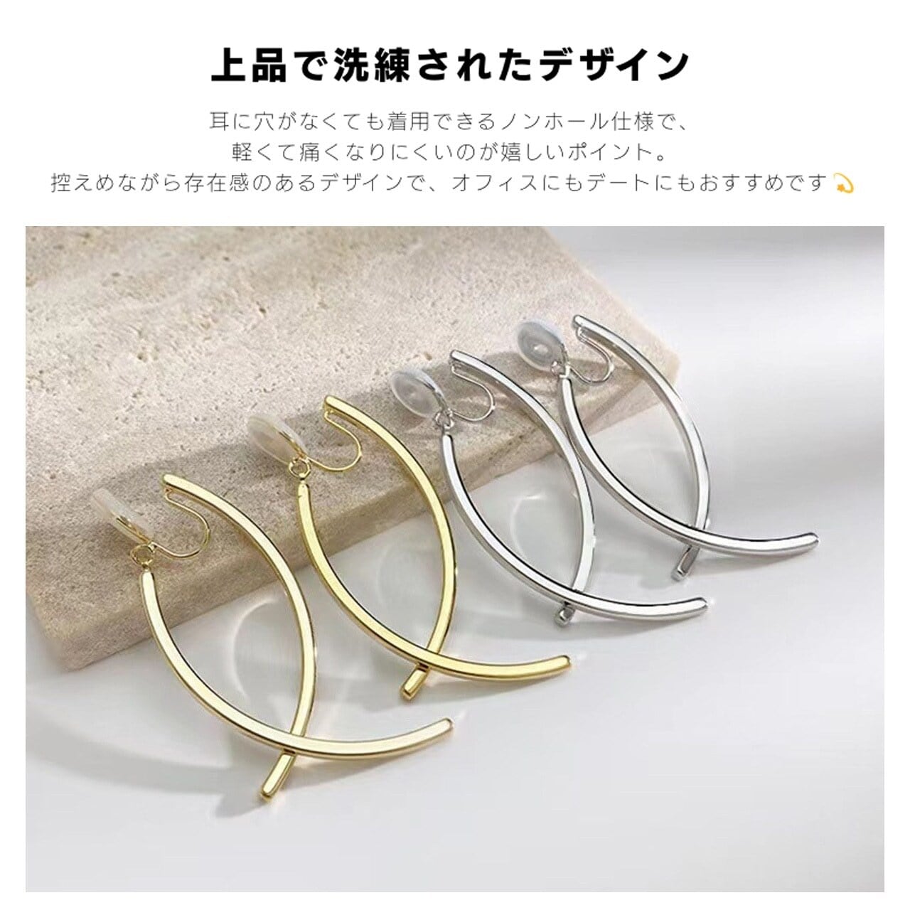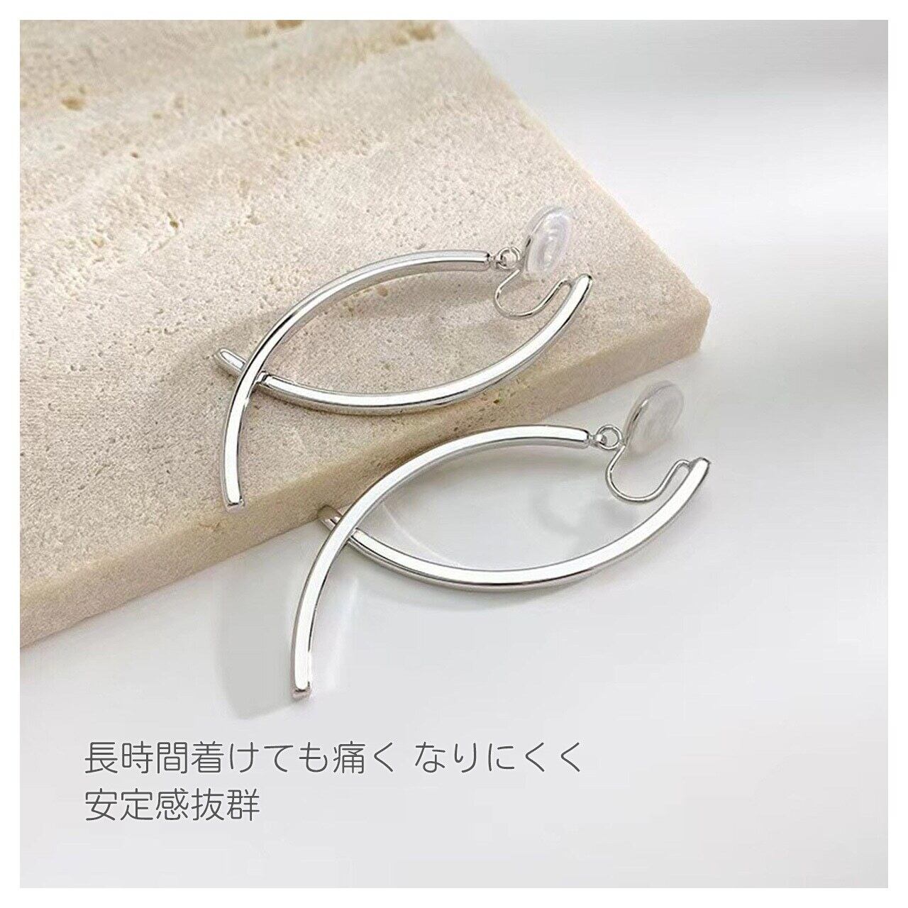 ピアスホールがなくても簡単に装着でき、ピアスホールのある方もそのまま装着できます。しっかりと固定され、圧迫感のない快適なつけ心地です。
