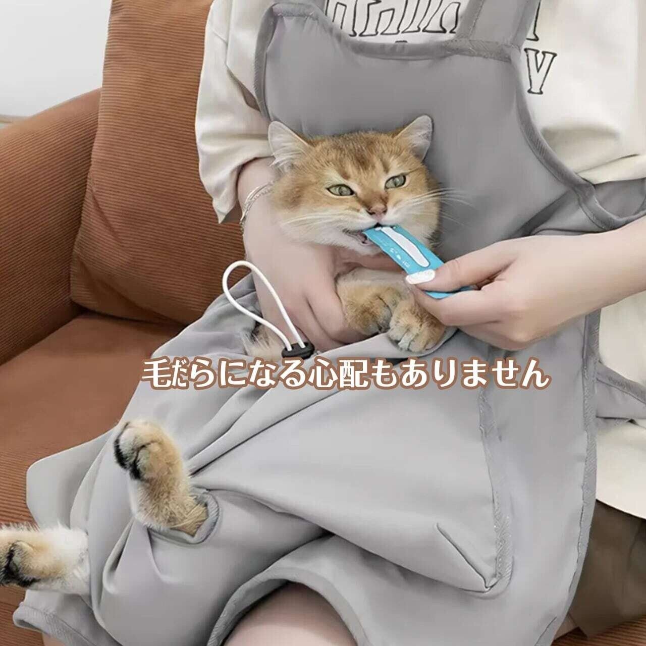 耐久性に優れた素材を使用しており、繰り返しの使用にも耐えます。また、手洗い可能なので清潔さを保ちやすく、愛猫との接触にも安心です。エプロンは軽量で動きやすく、飼い主さんにも快適な着用感を提供します。
