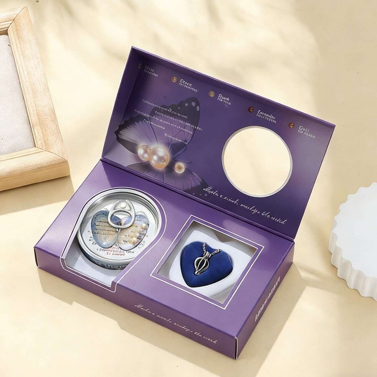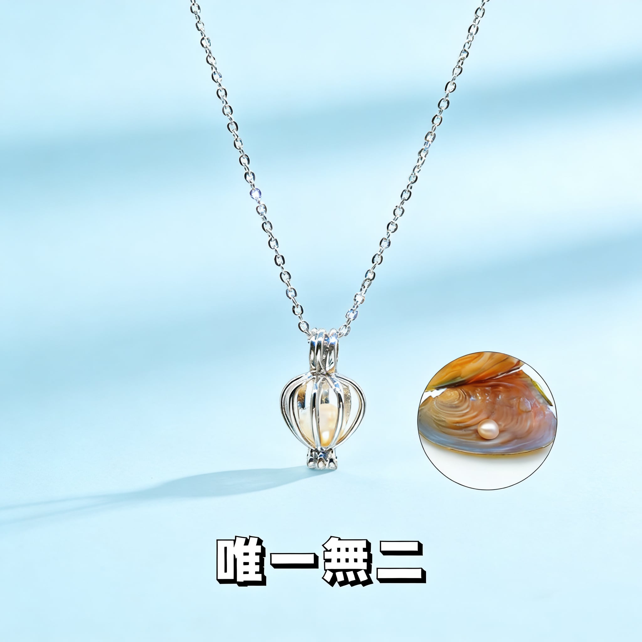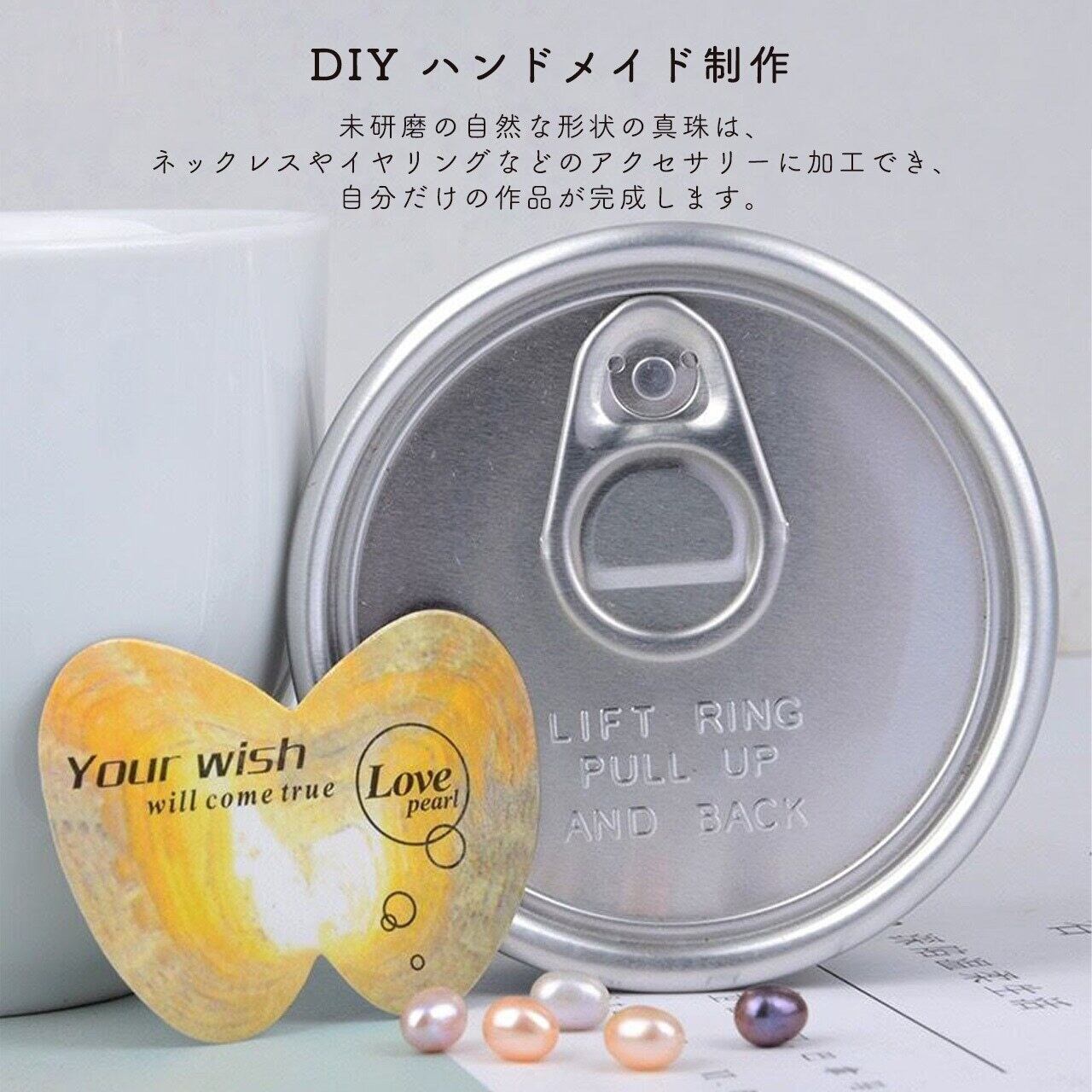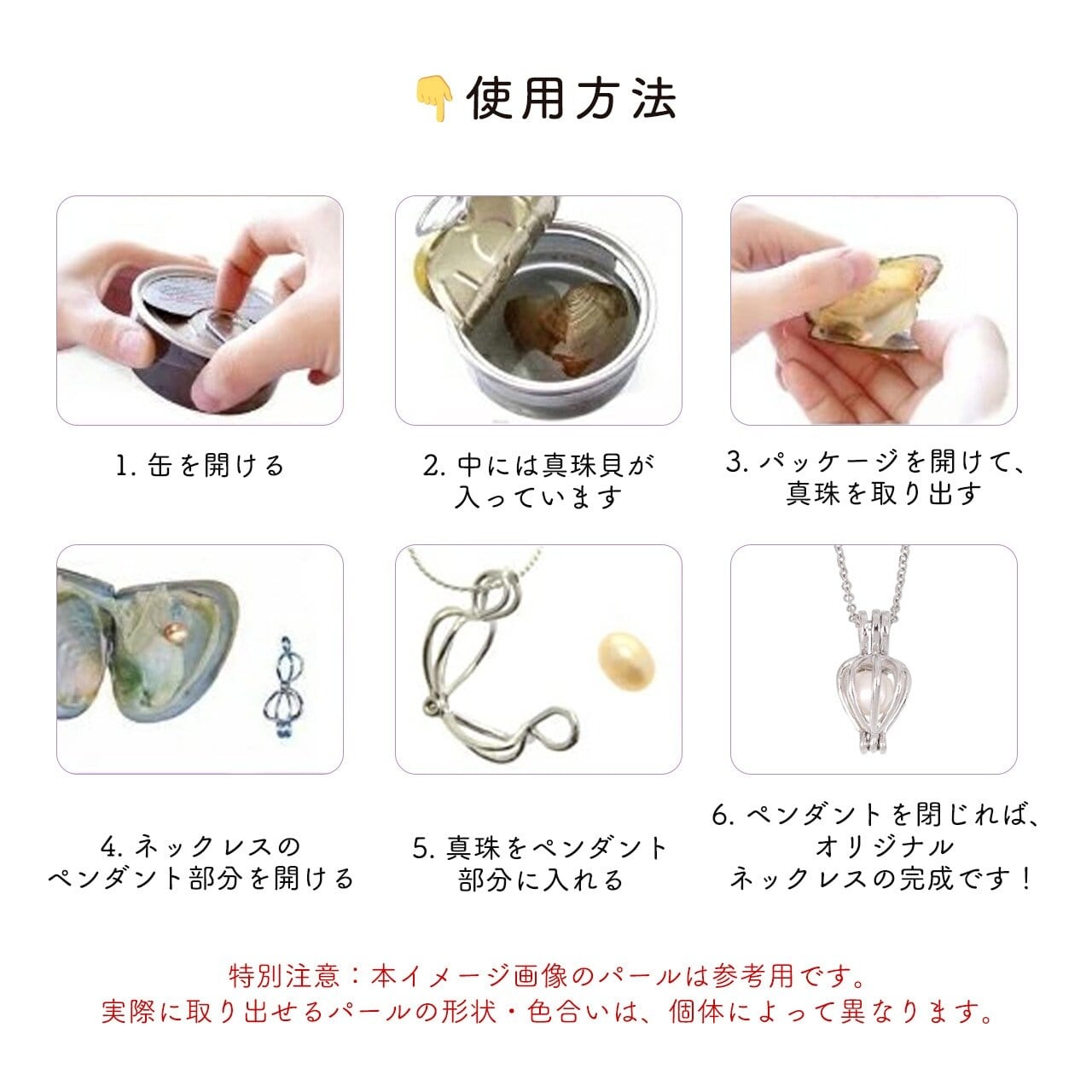 真空パックで新鮮さを封じ込めた貝缶を開けると、中から天然の淡水真珠が登場! 大小や光沢がそれぞれ異なる “唯一無二” の真珠を手に入れ、付属の金属ネックレスペンダントにセットするだけで、自分だけのオリジナルアクセサリーが完成します。