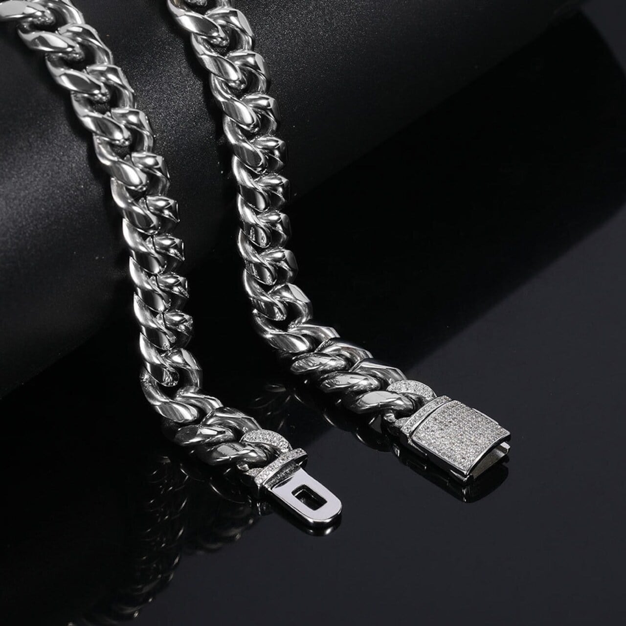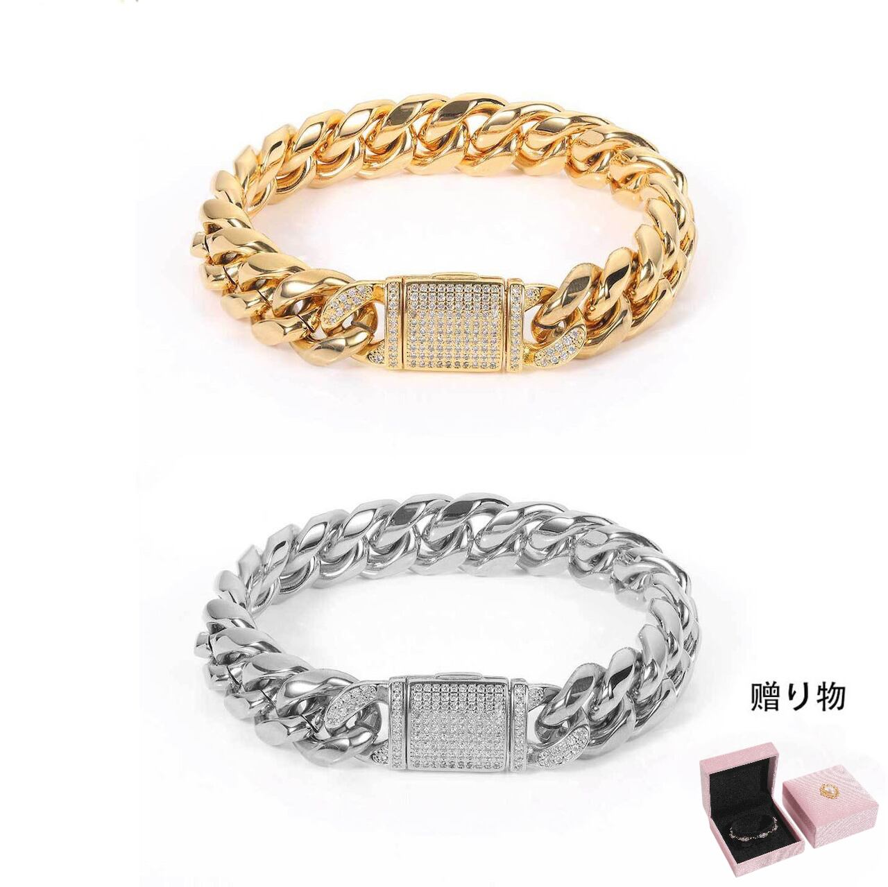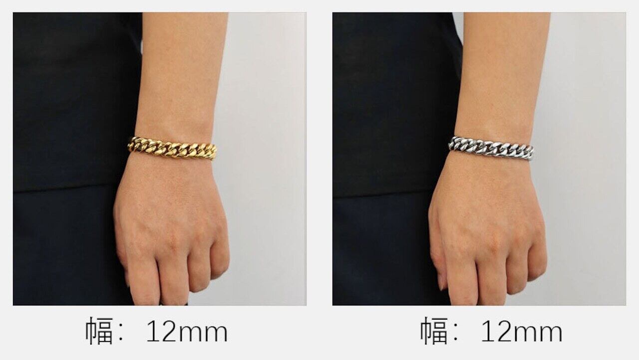■ 商品名:チタンスチールブレスレット 12mm ステンレスキューバチェーン 真金メッキ ジルコニア嵌め蓋留め メンズブレスレット