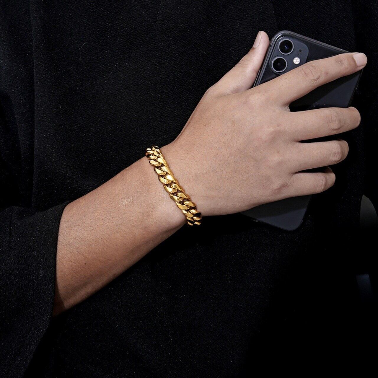 X 202.チタンスチールブレスレット 12mm ステンレスキューバチェーン 真金メッキ ジルコニア嵌め蓋留め メンズブレスレット