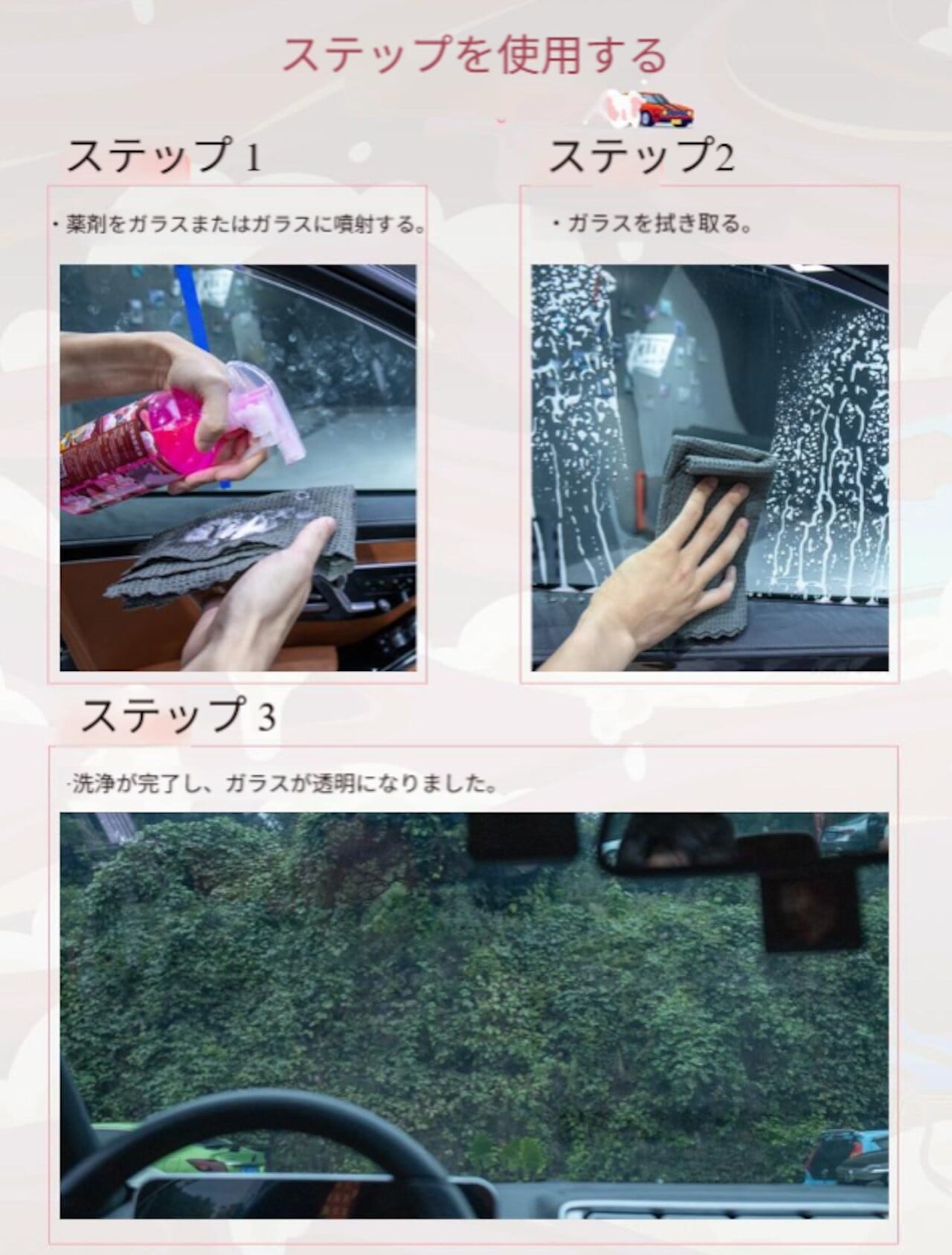 スプレータイプで、手軽に使えるのが魅力。必要な量を振りかけ、ブラシやスポンジでこするだけ。手軽に愛車の美しさを取り戻すことができます。普段のお手入れから、特別な日の前のお洗濯まで幅広いシーンで活躍します。