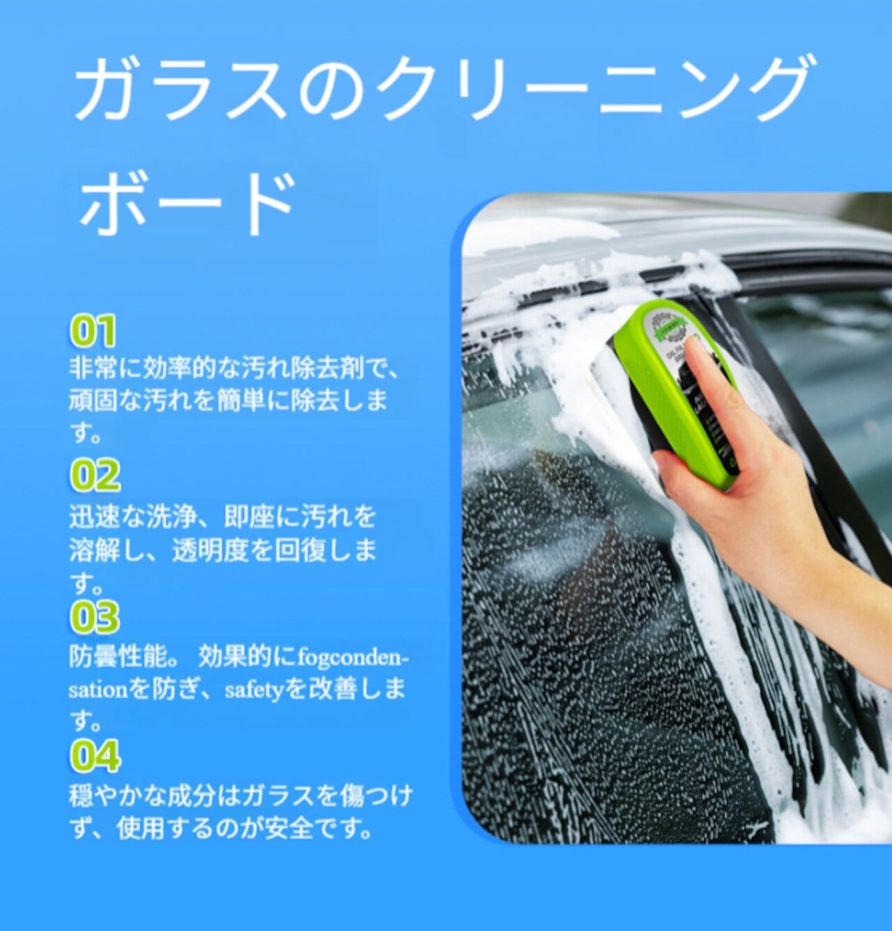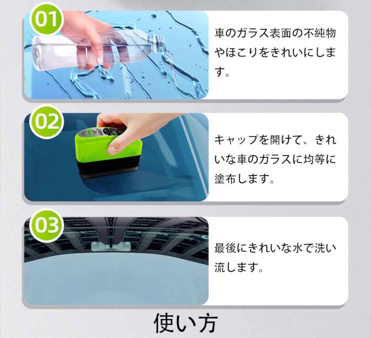 【幅広い適用性】自動車、オートバイ、トラック、バスなど、あらゆるタイプのフロントガラスに適しています。また、道路申請、鳥の糞や他の汚染物質を除去するための素晴らしいです