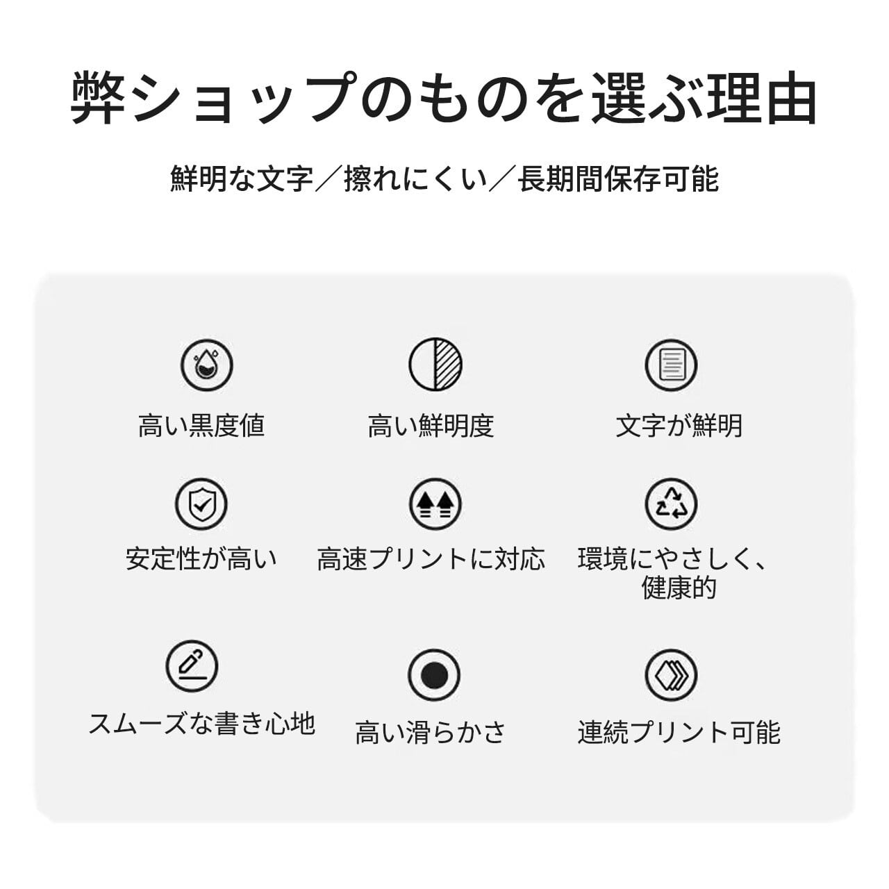 この感熱紙は、優れた防水・防油・耐アルコール性能を備えているため、さまざまな環境下でも安心してご使用いただけます。さらに、5年間の退色なしで、長期保存が可能です。大切な情報やメッセージを鮮やかに保ち続けます!