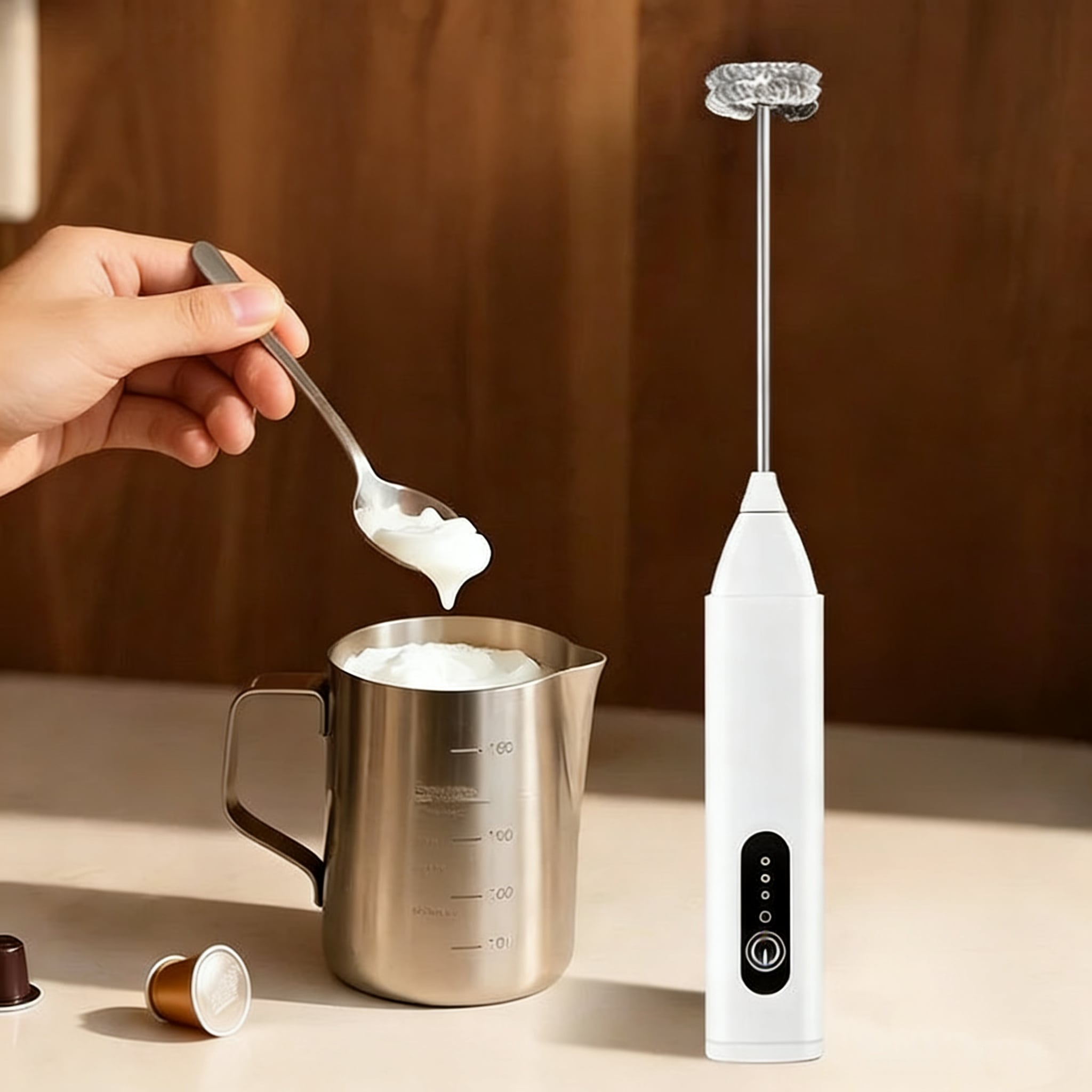 モーターのパワーで短時間でしっかり泡立てが可能です。手動で泡立てる手間を省き、簡単にお好みの泡を作り出します。また、コンパクトなデザインで収納も場所を取りません。キッチンでの使用はもちろん、アウトドアや旅行先でも活躍します。
