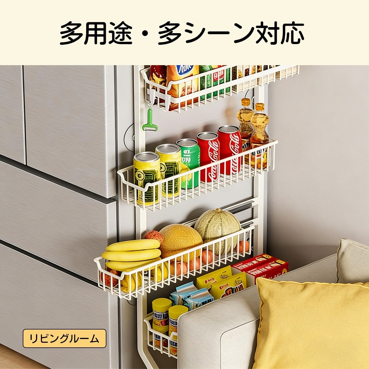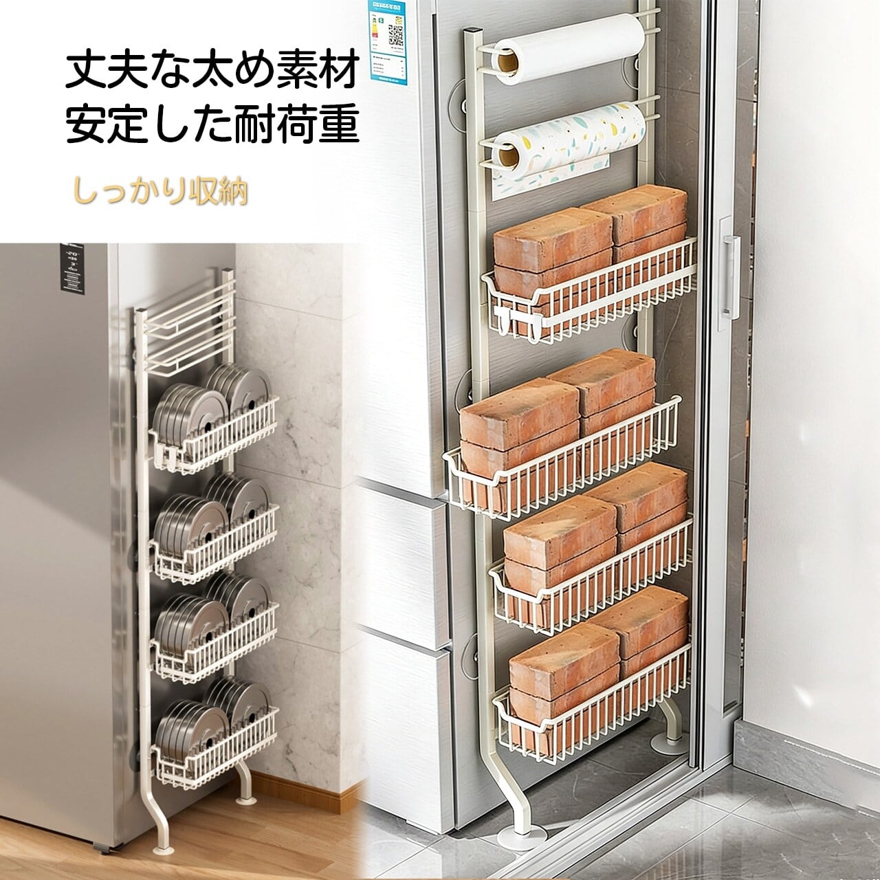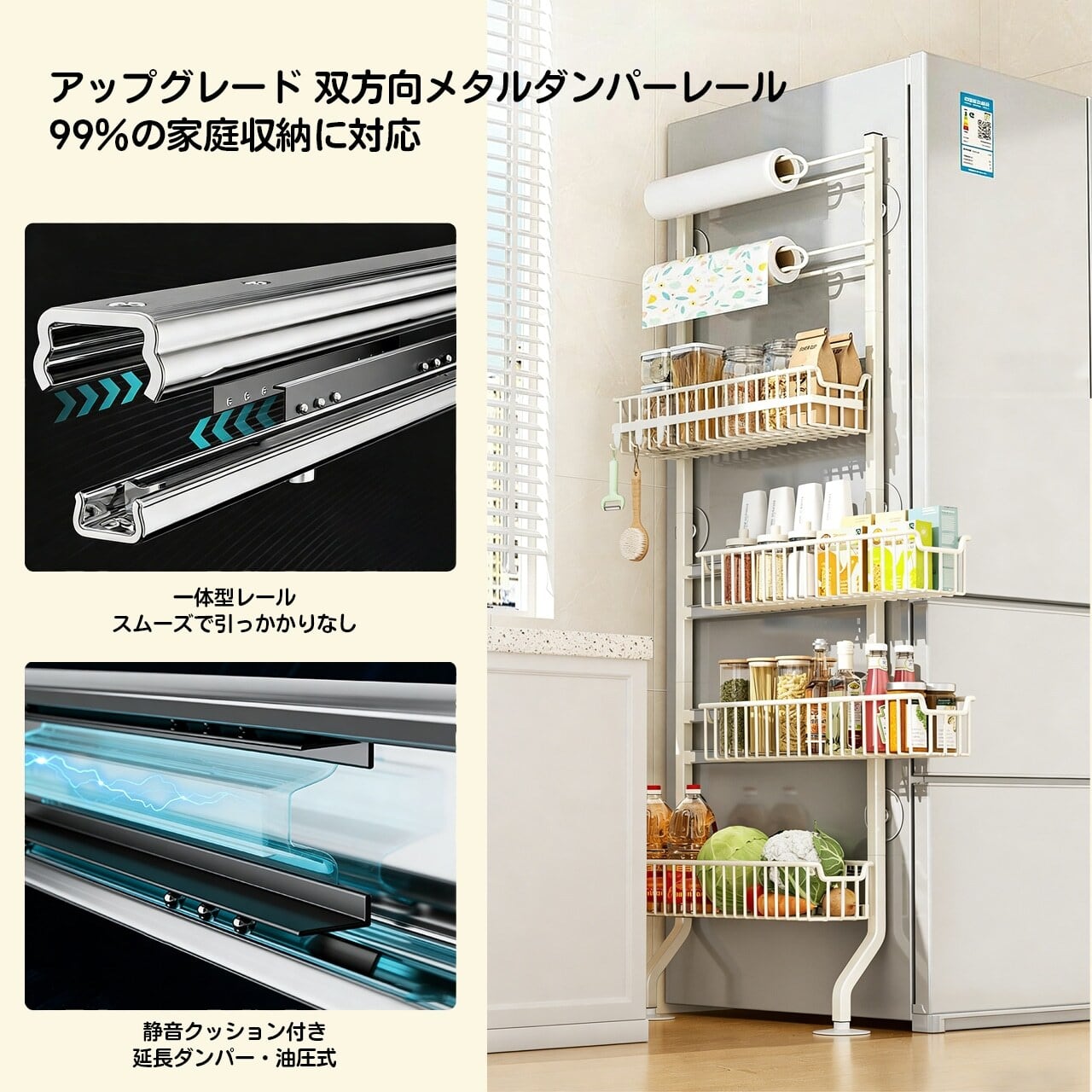 この収納ラックは、冷蔵庫の横にぴったりと寄せて設置できるスリムなデザインが特徴です。多段式で調味料やキッチン小物を効率よく整理でき、使いやすさと見た目の美しさを両立しています。
