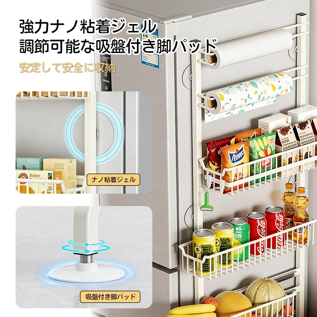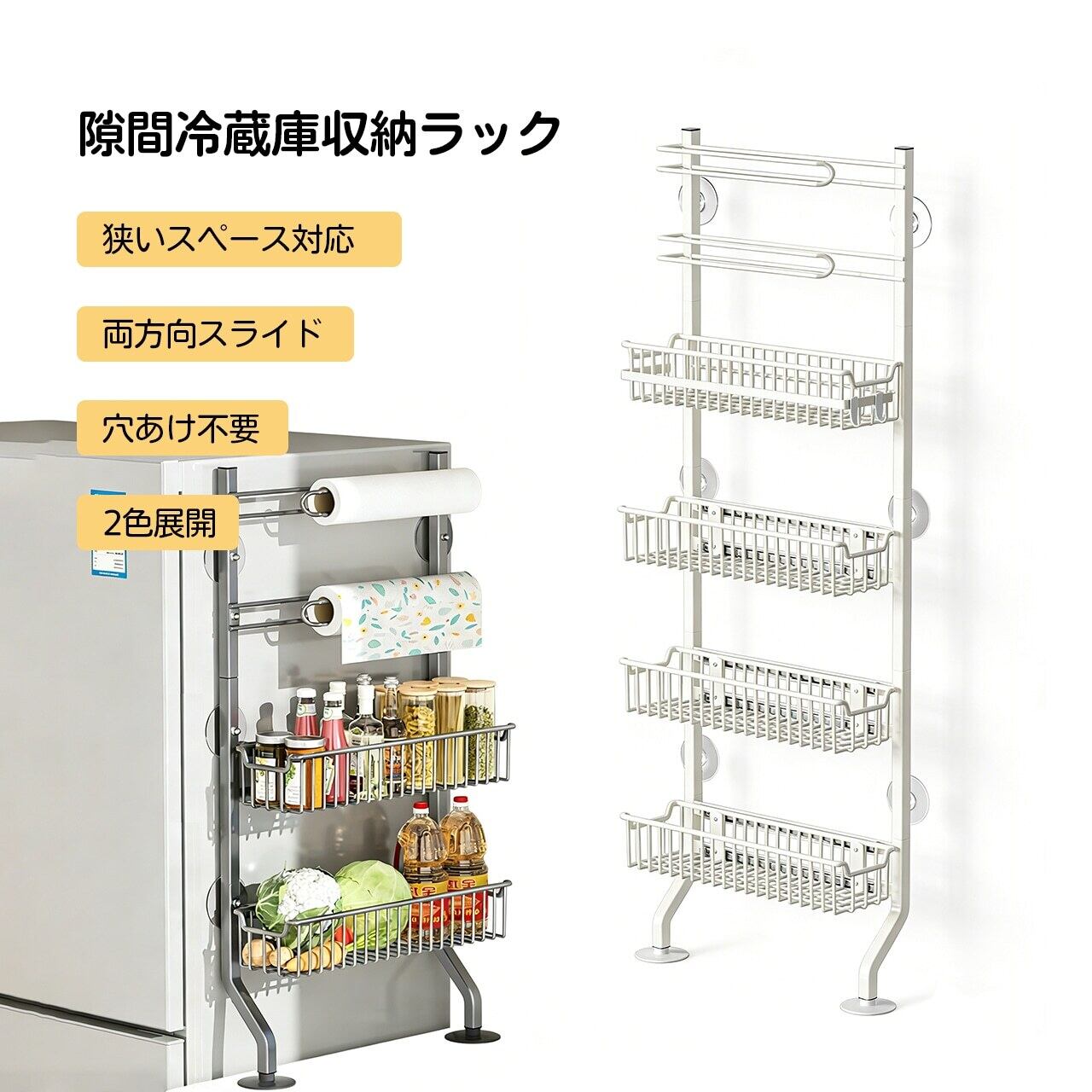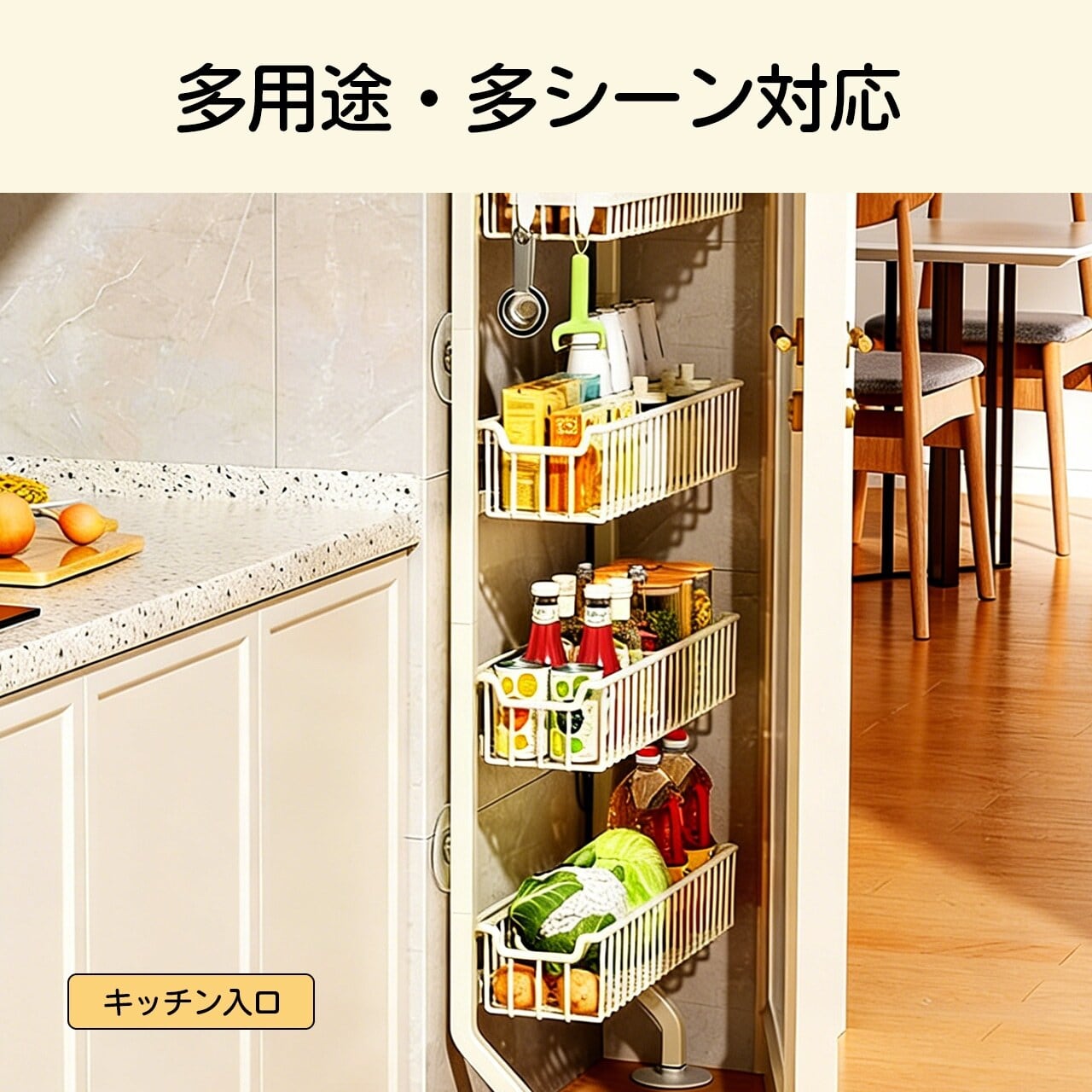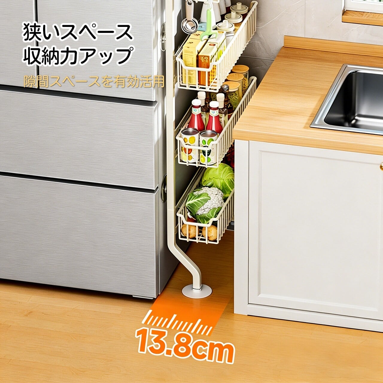 壁や冷蔵庫横の隙間に差し込むだけで、調味料やキッチン小物をスッキリ整理。