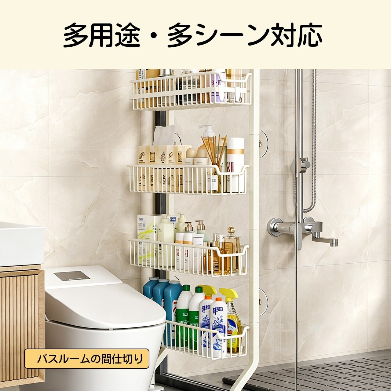 スリムな形状ながら、収納力は抜群!小さなスペースにフィットし、調味料のボトルやキッチンツールをすっきり収めることができます。壁に寄せて設置することで、キッチン全体が広々と感じられます。