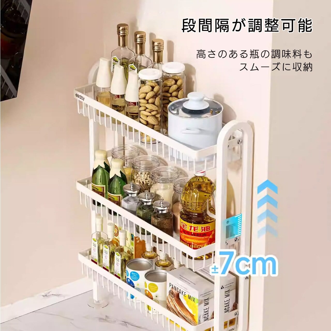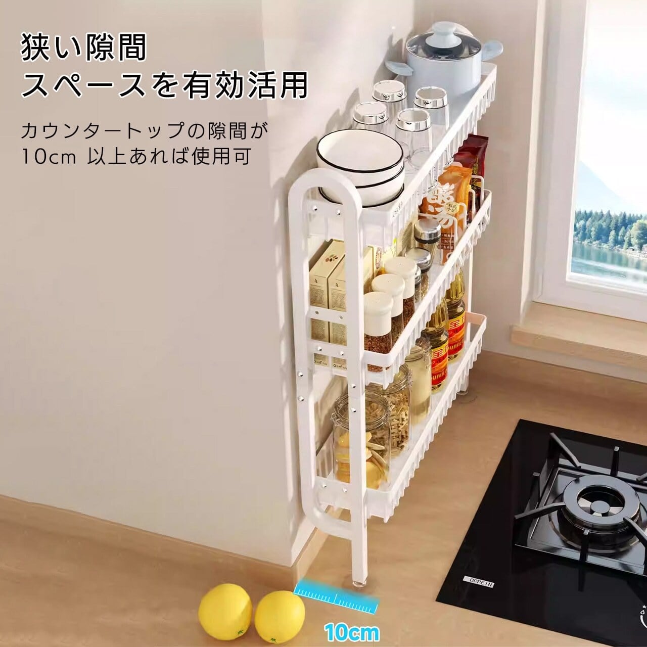 極狭タイプでキッチンの壁面隙間にピッタリフィット、壁掛け設計で台面スペースを完全解放、多段式収納で調味料缶・ソースボトル・キッチン小物までまとめて収納。