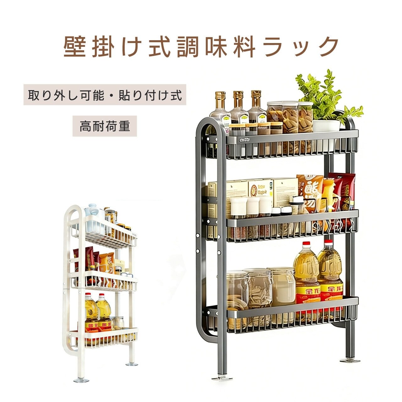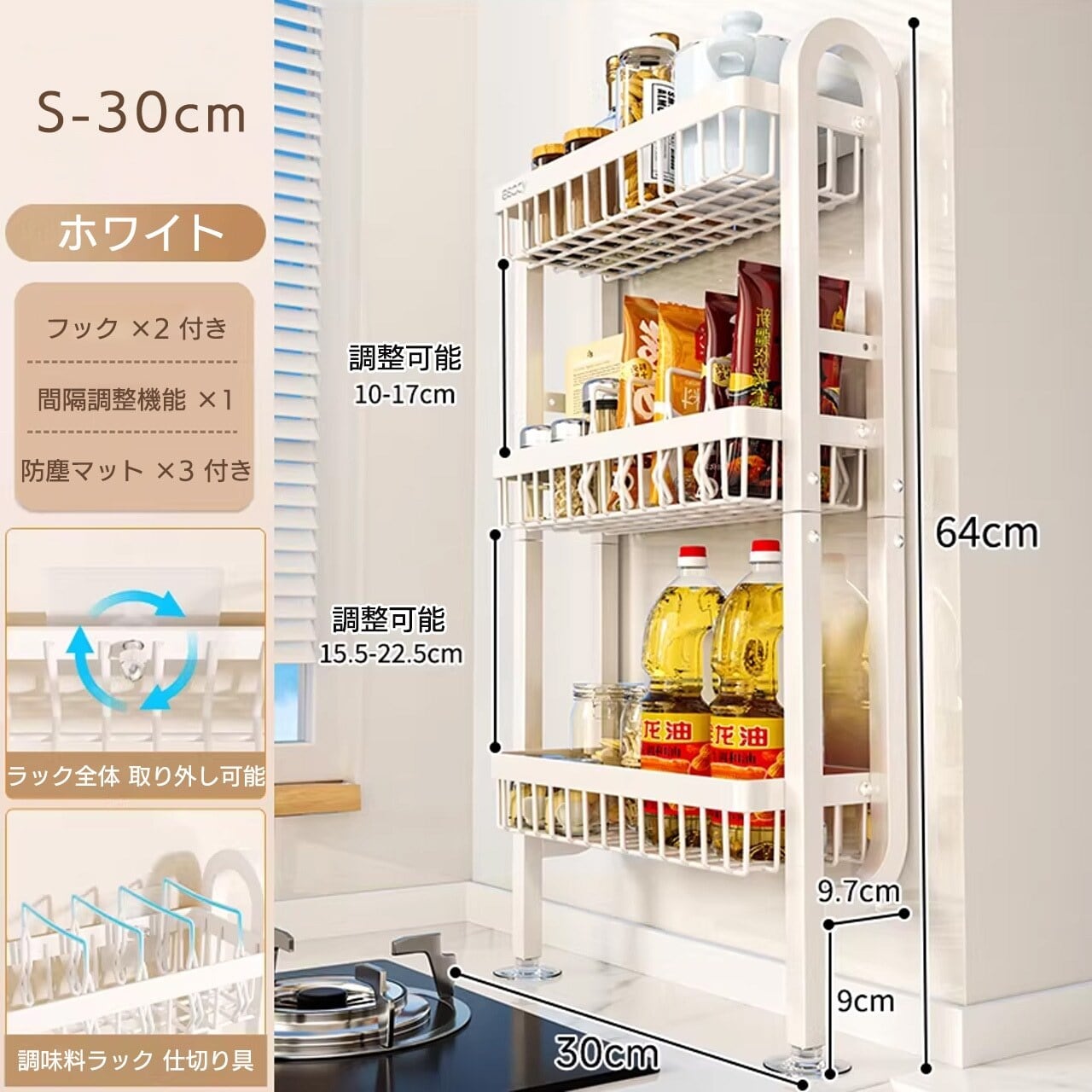 最小限のスペースで多くの調味料や小物を収納可能。限られた空間でも無駄なく使えます。