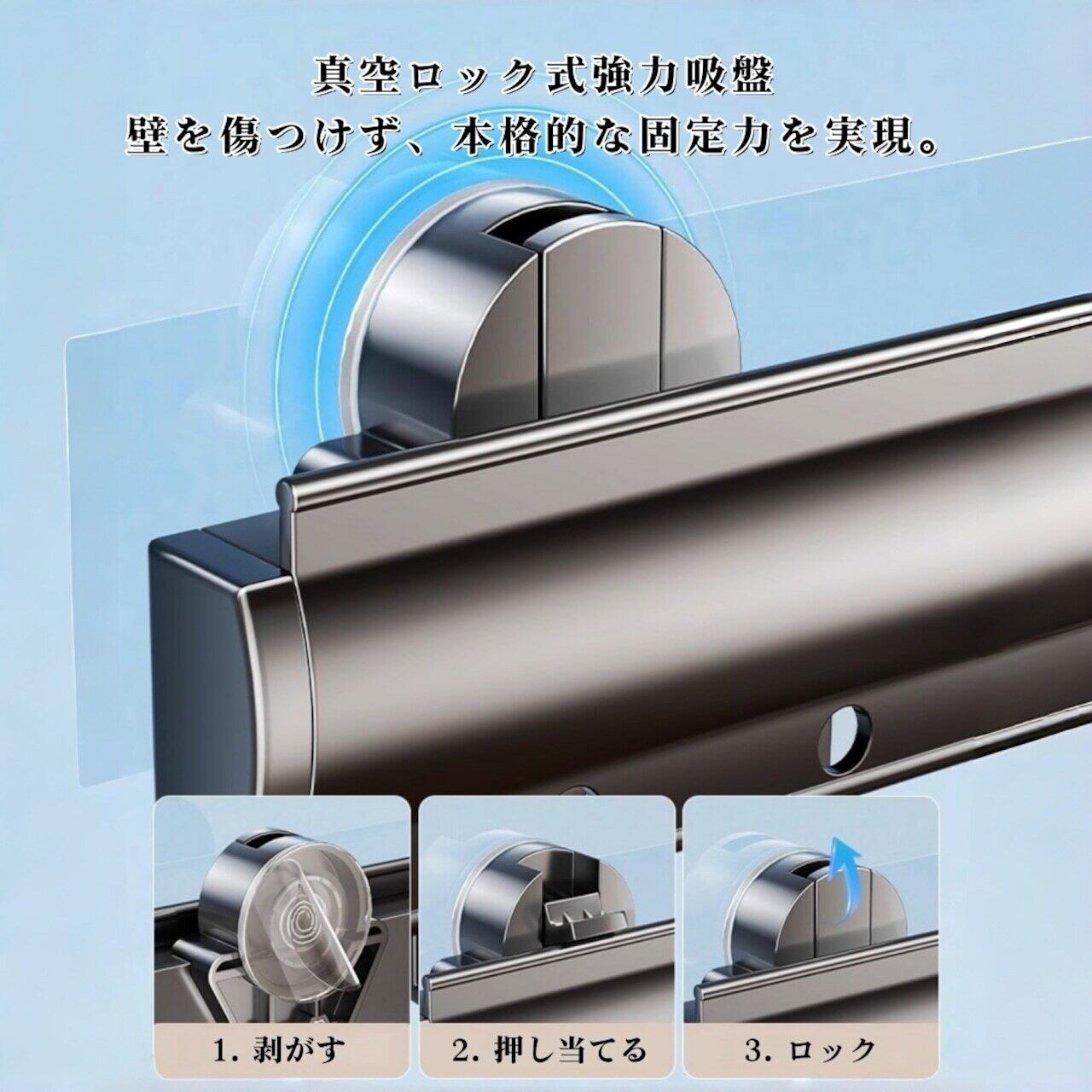 強力な真空吸着式。剥がす際も壁に痕が残りにくく、賃貸住宅でも安心。吸盤は水洗いすることで吸着力を復活させられ、半永久的に繰り返し使用可能です。