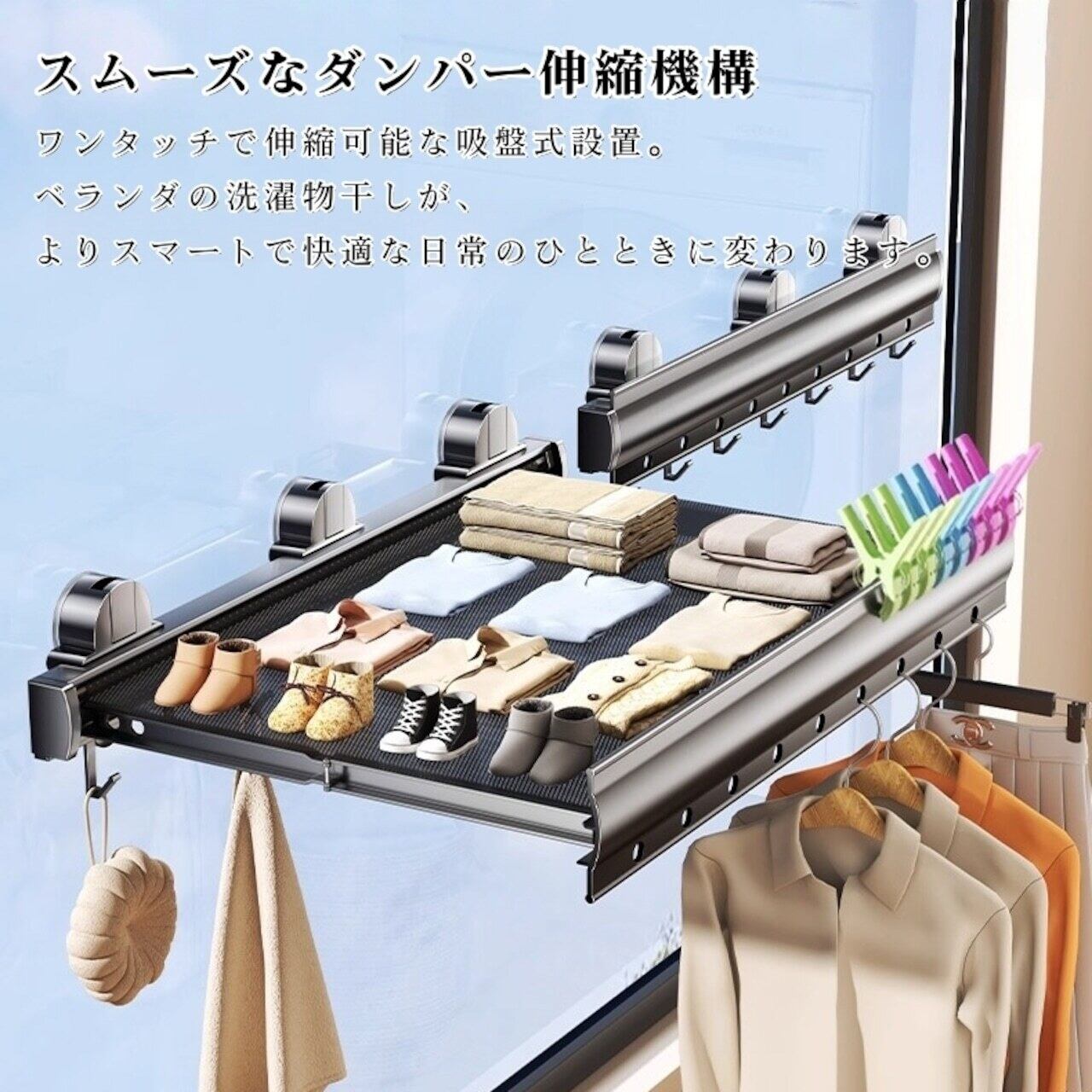 ベランダの洗濯物干しはもちろん、浴室のタオル掛けや、室内での小物干しにも。