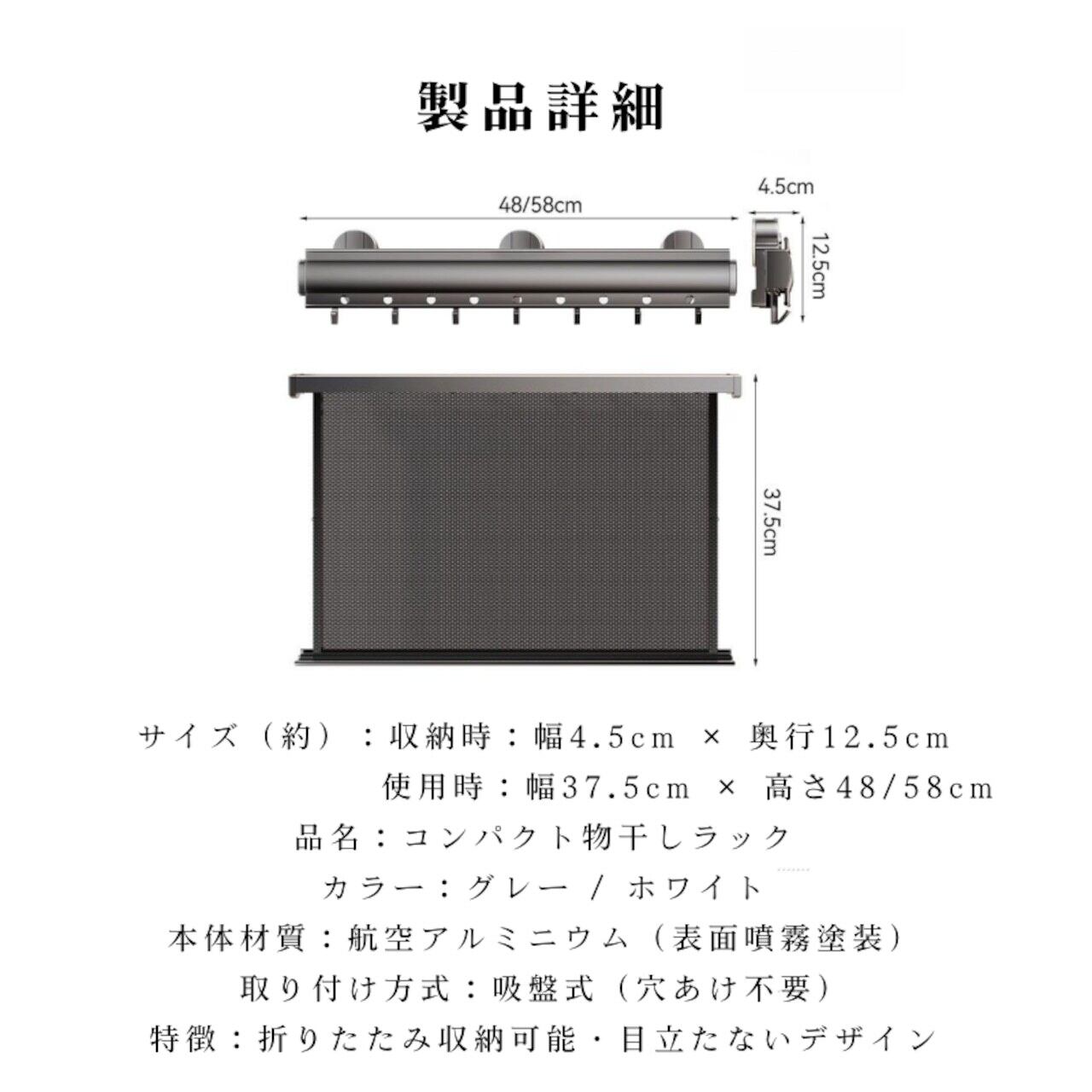 L 282.ンパー伸縮 折りたたみ物干しラック 吸盤式 伸縮式 梅雨対策 省スペース 壁掛けハンガー ベランダ 浴室 靴下干し 洗濯物 室内干し
