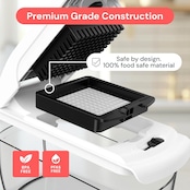 使いやすさと精密なカットを両立するために設計された本品は、食品接触部に BPA フリーの安心素材を使用。握りやすいソフト TPU ハンドルと、最大限の安定性を実現する滑り止めラバーベースを搭載しています。内蔵のキャッチトレイが食材の飛び散りを防ぎ、キッチンカウンターを常に清潔に保てるため、毎日の食事準備をストレスフリーに。新築祝いのプレゼントにもぴったりのアイテムです。